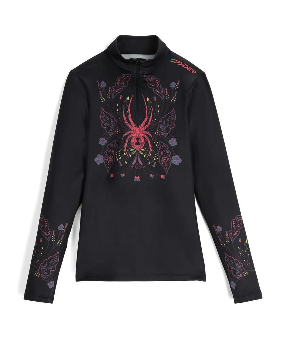 Spyder Vivid 1/2 Zip je dámsky technický rolák navrhnutý ako stredná alebo základná vrstva pre zimné športy aj aktívny pohyb v chladnom počasí. Spája funkčnosť, pohodlie a štýlový dizajn s výraznými grafikami typickými pre značku Spyder. Pružný úplet s technológiou odvádzania vlhkosti. Slim fit – priliehavý, ale pohodlný strih na vrstvenie. YKK® polovičný zips pri krku – umožňuje jednoduchú reguláciu teploty.
